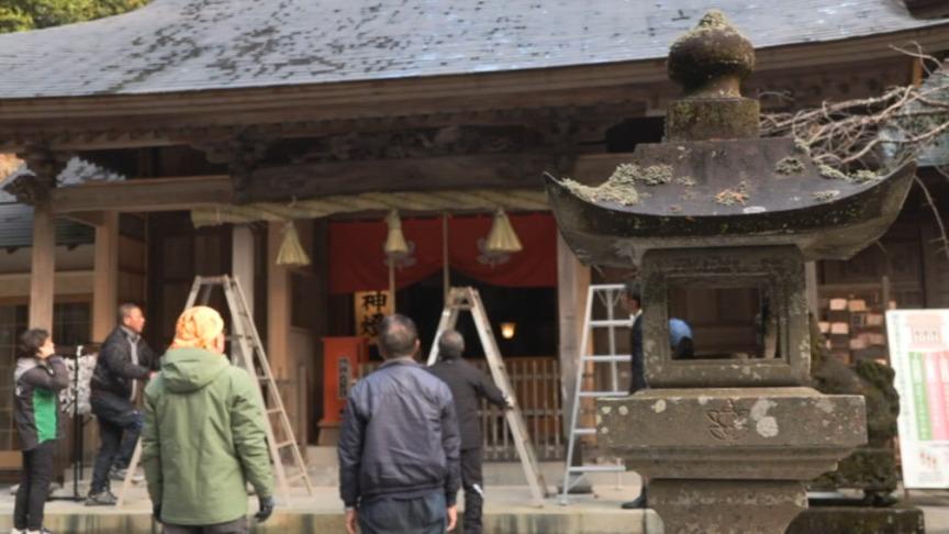 伊萬里神社で迎春の準備整う 新しいしめ縄の付け替え作業(12月21日)